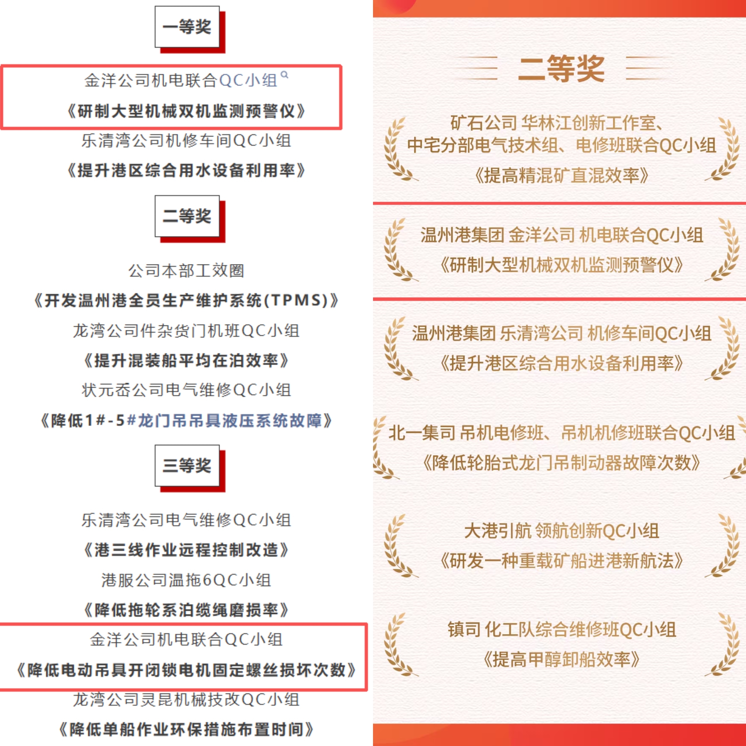 近日,金洋公司机电联合QC小组主导的两项QC课题捷报频传:《研制大型机械双机监测预警仪》《降低电动吊具开闭锁电机固定螺丝损坏次数》先后斩获2025年温州港集团QC成果一等奖与三等奖,其中《研制大型机械双机监测预警仪》再传佳绩,于11月4日荣获海港集团QC成果二等奖,以硬核技术创新为港口大型机械安全运营注入强劲动能。
