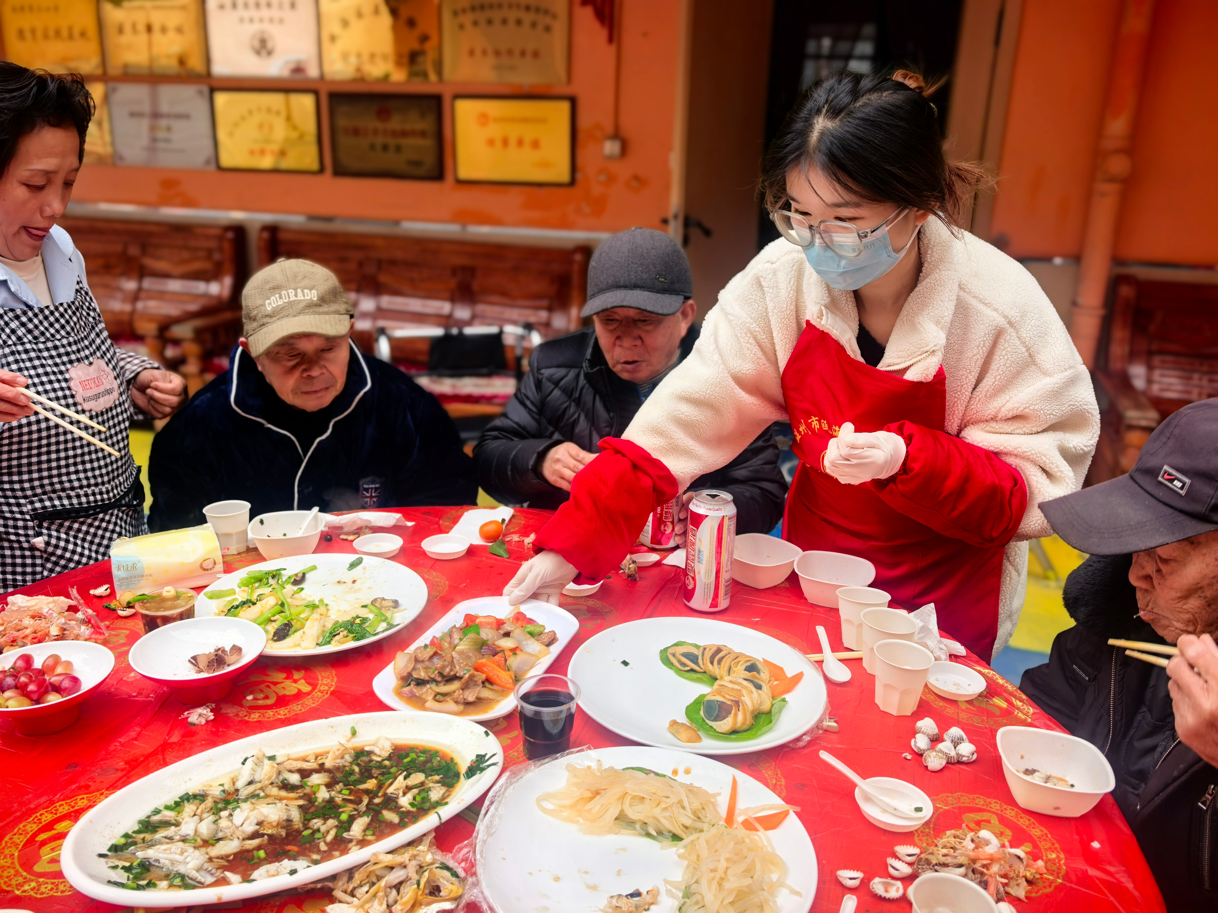 活动现场,青年志愿者们分工明确、干劲十足。有的与老人们促膝谈心,拉家常、问冷暖;有的撸起袖子,洗菜切配、起锅烧油,热火朝天地准备菜肴。数小时后,一桌桌丰盛可口的酒席整齐摆开,老人们围坐一堂,品尝着美味佳肴,脸上洋溢着幸福的笑容,现场欢声笑语不断,温情满满。