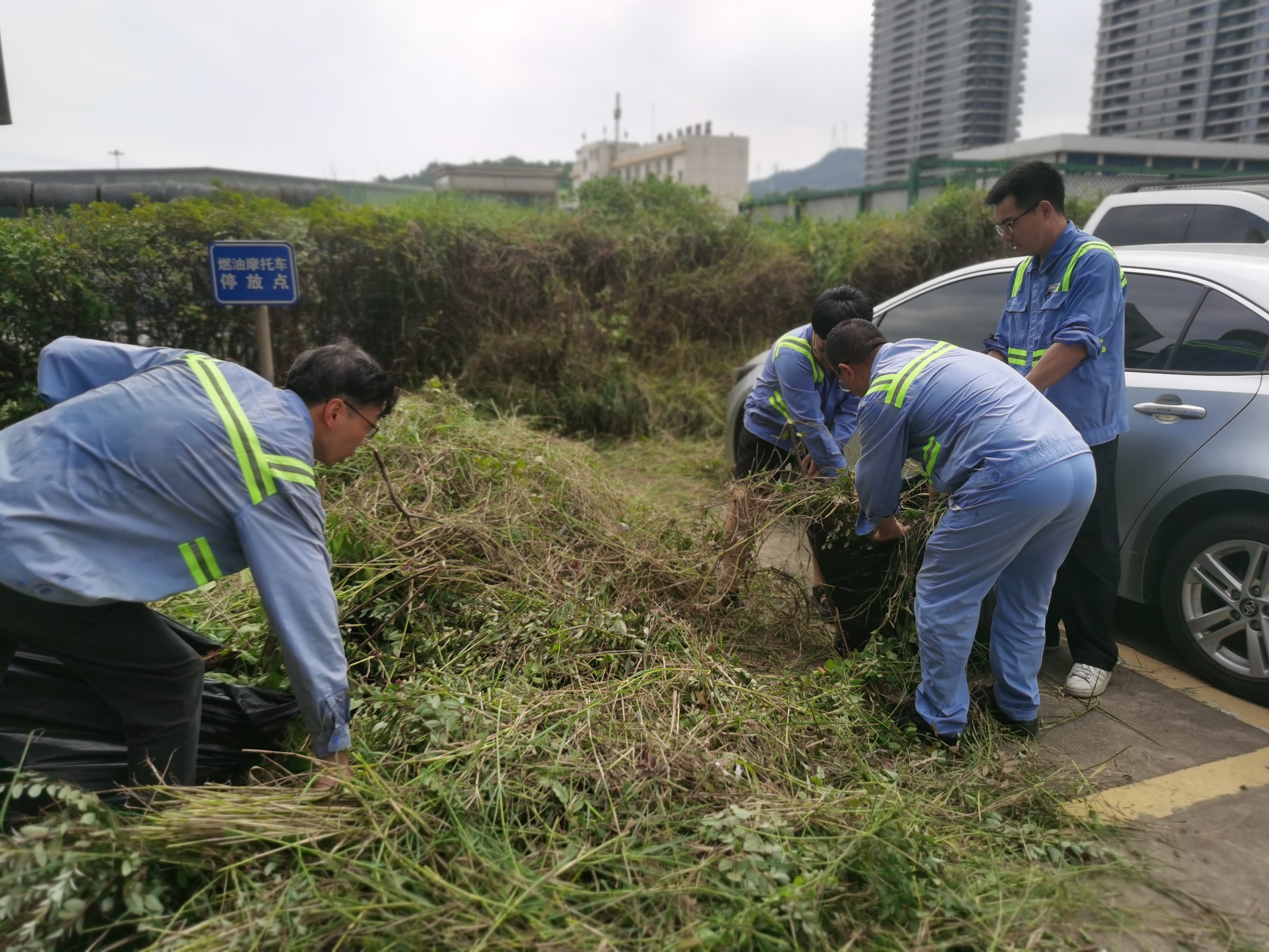 活动当天,志愿者们戴好纱布手套,携带园林修剪专业工具,准时奔赴各自责任区域。活动现场气氛热烈,秩序井然。大家分工明确,配合默契。有的手持专业剪刀,利落地修剪过高杂草;有的挥动锄头,仔细清理深扎的顽固草根;还有的成员则负责清理绿化带的垃圾并协同清运,将收集起来的枯枝败叶快速转运处理,确保作业面整洁。